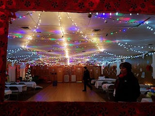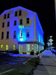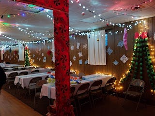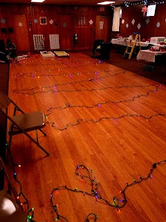 This was the scene outside of the Amherst VFW, where we held the holiday party. I was always part of the decorating party because I provided the lights. This is the rail outside with the gently fallen snow.
