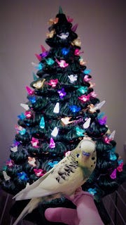 Buddy in front of my ceramic tree that has been around for ages on New Years Eve. It was a rainy new years eve that year casting 2016 off to bring in 2017.