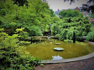 The pond in their secret garden had a bit of algae because of all of the warm humid rain.