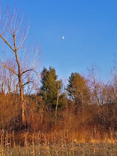 A picture of the sunset with the moon on my way back from the roundabout construction that I would walk to just about every day after work.