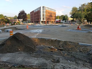 The roundabout almost ready for a last week of August soft opening. We actually met the Amherst Town Engineer when we went from transit to investigate the possible opening. The engineer admitted that he loved roundabouts so much that he drew all of the intersections in town on the back of napkins.