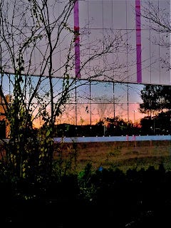 A sunset reflecting off of the new chiller plant near the transit parking lot.