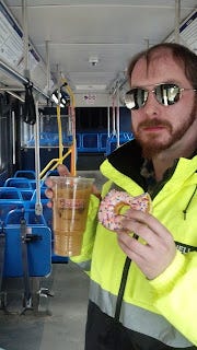I was treated to a pink sprinkled donut, because my trainee thought that the jacket made me look like a cop, and that flavour of donut is the one we both pictured as the stereotypical cop donut.